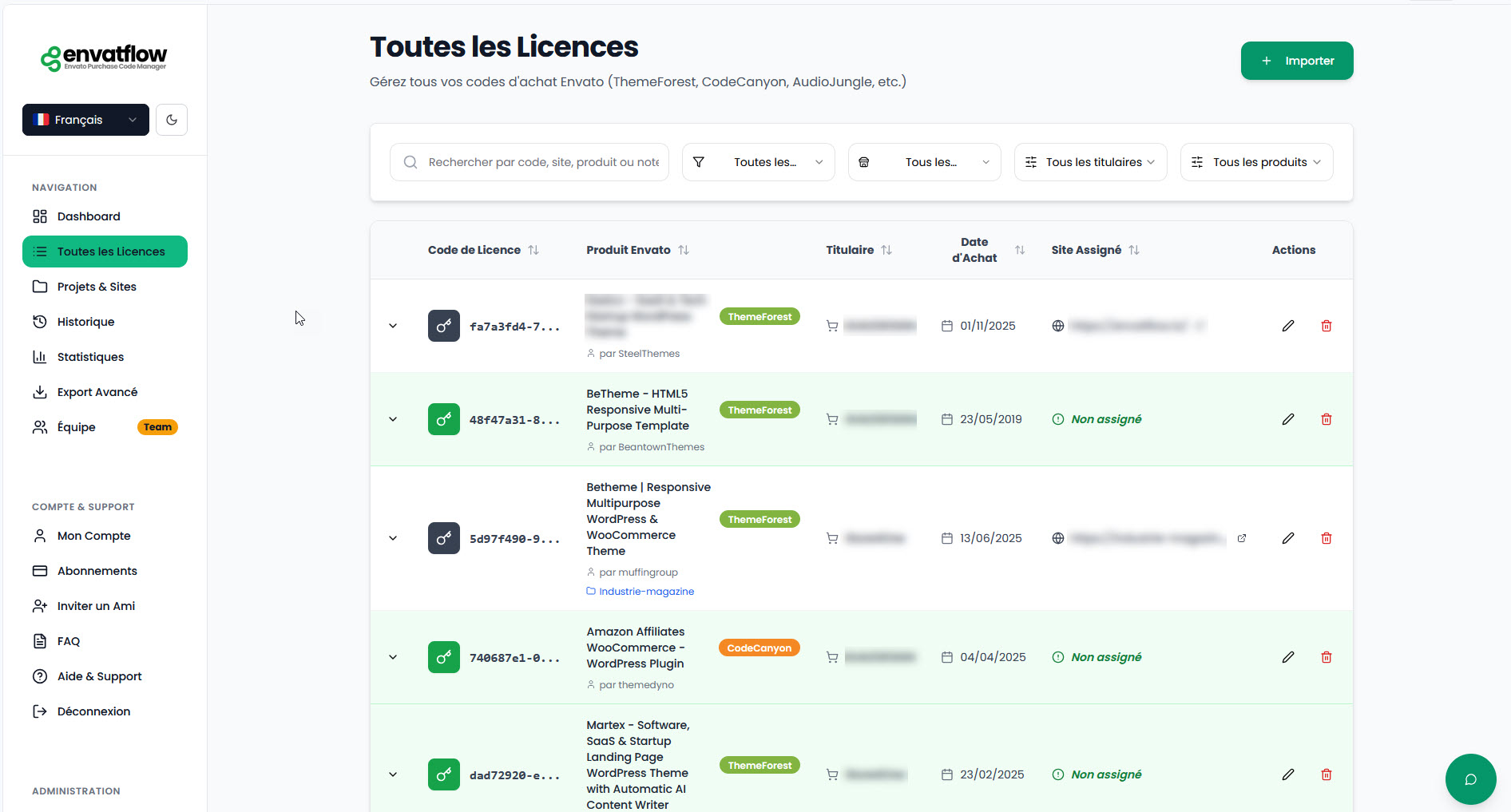 Plus besoin de chercher vos codes d’achat dans vos e-mails ou sur chaque marketplace. Avec EnvatFlow.io, tout est regroupé, organisé, et prêt à être utilisé.Que vous gériez 10 ou 1 000 licences, la plateforme s’adapte à vos besoins.